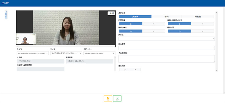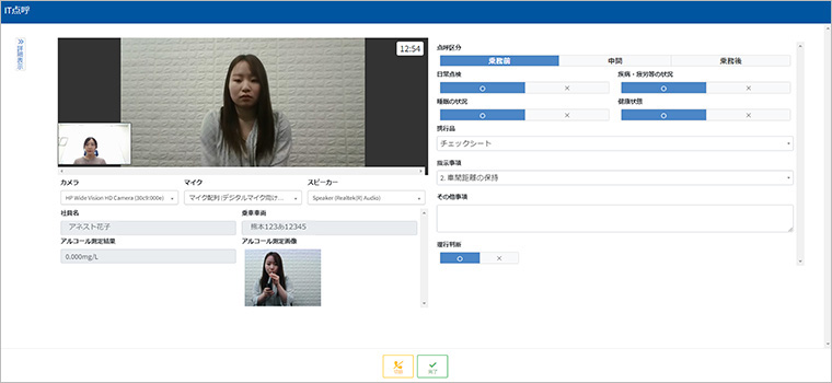 スマートフォンとPC間でビデオ通話をしながら行える点呼になります。